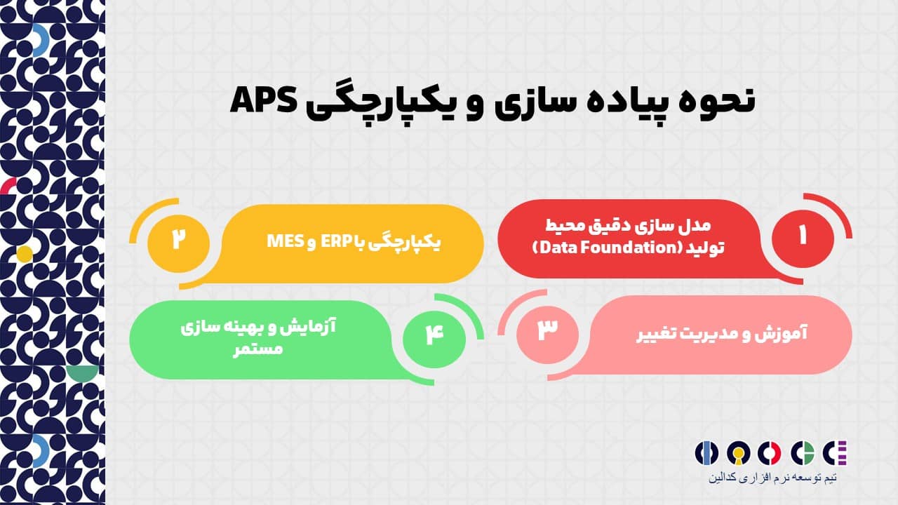 پیاده سازی APS یک پروژه تخصصی است که نیازمند همکاری نزدیک تیم های فناوری اطلاعات، تولید و مدیریت است و معمولاً شامل مراحل زیر است: