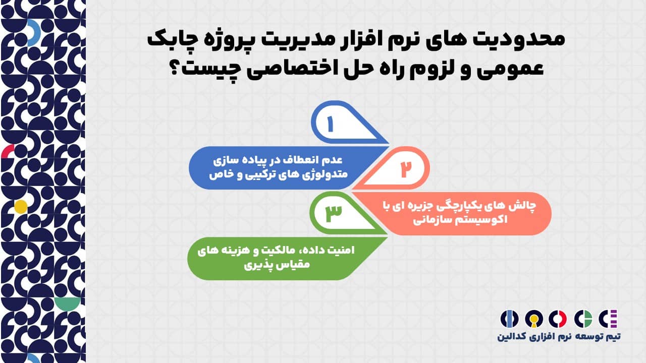 با وجود تمام مزایا، ابزارهای عمومی مدیریت پروژه چابک (مانند Jira Cloud، Trello، Asana و غیره) که برای بازار انبوه طراحی شده اند، در مواجهه با نیازهای پیچیده و خاص سازمان های بزرگ، دچار چالش های جدی می شوند.