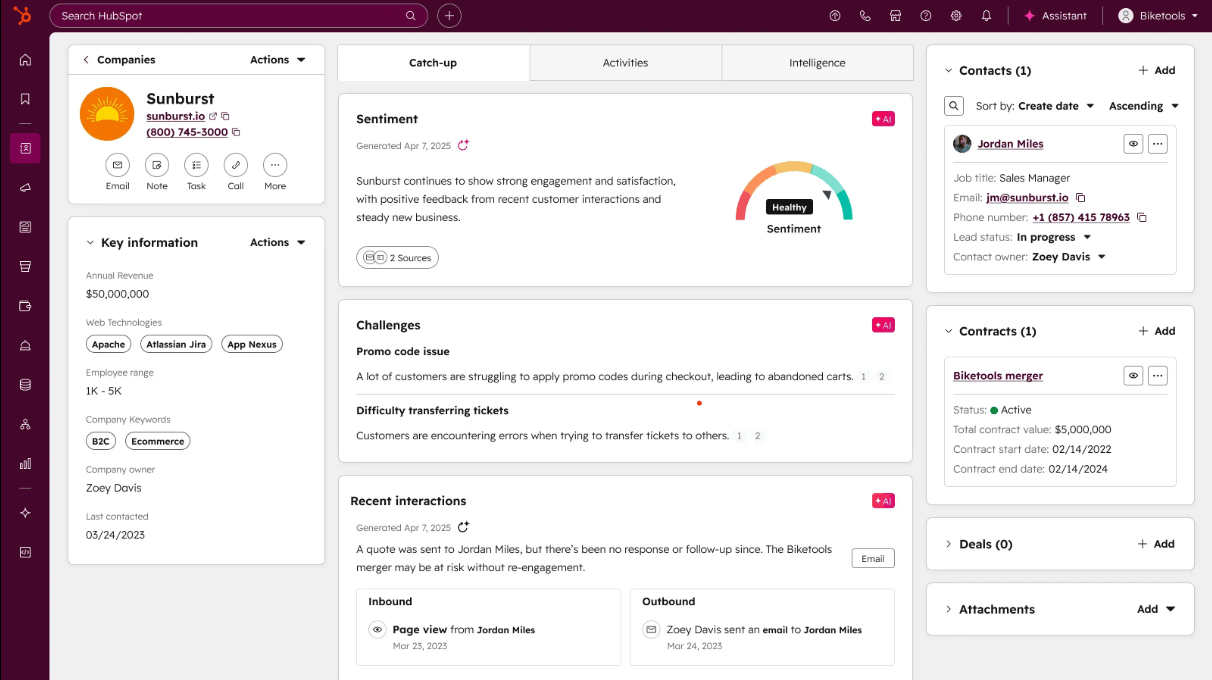HubSpot CRM تمرکز خود را بر هم راستاسازی تیم های بازاریابی و فروش قرار داده و هوش مصنوعی در نرم افزار CRM را در بستر اتوماسیون بازاریابی توسعه داده است. این پلتفرم رفتار کاربران وب سایت، نرخ تعامل با محتوا، پاسخ به ایمیل ها و مسیر حرکت در قیف فروش را تحلیل می کند.