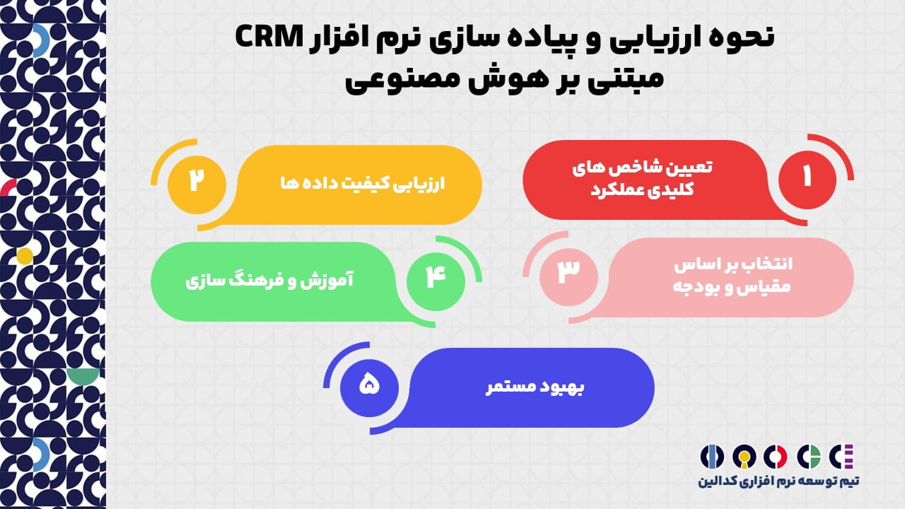 پس از بررسی نمونه های برتر خارجی و داخلی، گام بعدی برای هر سازمانی که قصد بهره گیری از هوش مصنوعی در نرم افزار CRM را دارد، طراحی فرآیند ارزیابی و پیاده سازی است. پیاده سازی موفق فقط به نصب نرم افزار محدود نمی شود؛ بلکه شامل آماده سازی داده ها، تعریف شاخص های عملکرد، آموزش تیم و بهبود مستمر است. در ادامه، مراحل کلیدی این مسیر را بررسی می کنیم.