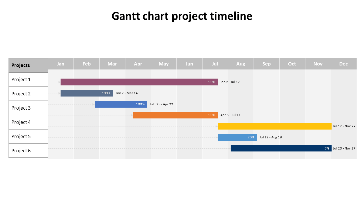 در بخش بالایی نمودار، یک محور زمانی قرار دارد که بسته به نوع پروژه می تواند بر اساس روز، هفته یا ماه تنظیم شود. این خط زمان نشان می دهد هر فعالیت دقیقاً در چه بازه ای آغاز می شود و چه زمانی به پایان می رسد. مقیاس زمانی در نرم افزارهای مدیریت پروژه قابل تغییر است و این امکان را فراهم می کند که مدیران پروژه بتوانند برنامه را در سطوح کلان یا جزئی بررسی کنند. برای مثال، در پروژه های بلندمدت، مشاهده نمای ماهانه کاربردی تر است، در حالی که در پروژه های کوتاه مدت یا چابک، نمای روزانه یا هفتگی دقت بیشتری ایجاد می کند.