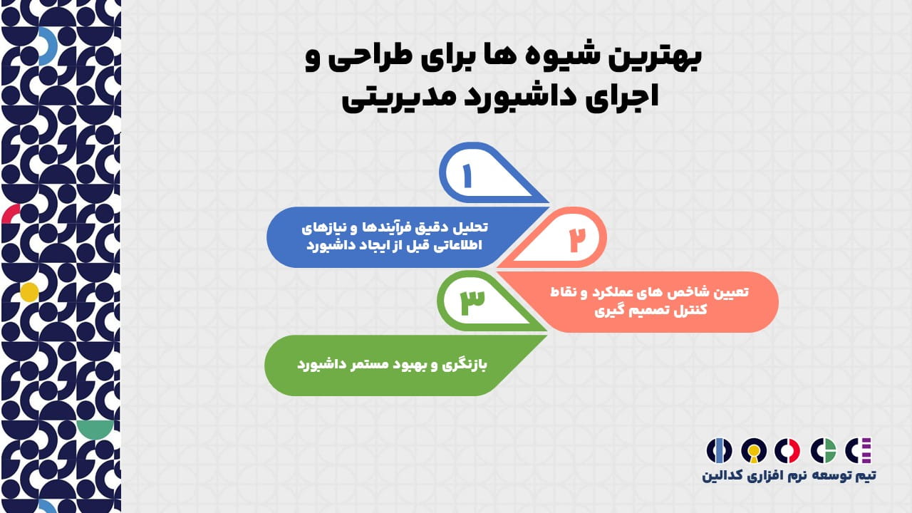 یک طراحی موفق داشبورد مدیریتی نیازمند برنامه ریزی دقیق، شناخت نیازهای اطلاعاتی سازمان و بازنگری مستمر است. داشبورد باید با اهداف استراتژیک سازمان همسو باشد و امکان پایش دقیق شاخص های عملکرد و تصمیم گیری هوشمند را فراهم کند. بدون طراحی اصولی و توجه به جزئیات، داشبورد تنها یک نمایش گرافیکی داده ها خواهد بود و نقش تحلیلی و عملیاتی خود را از دست می دهد.